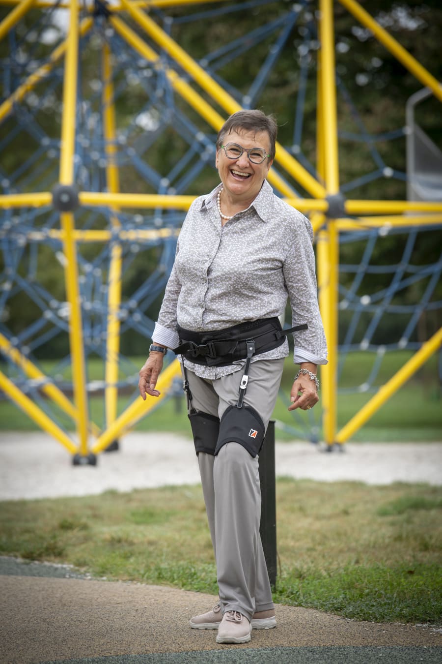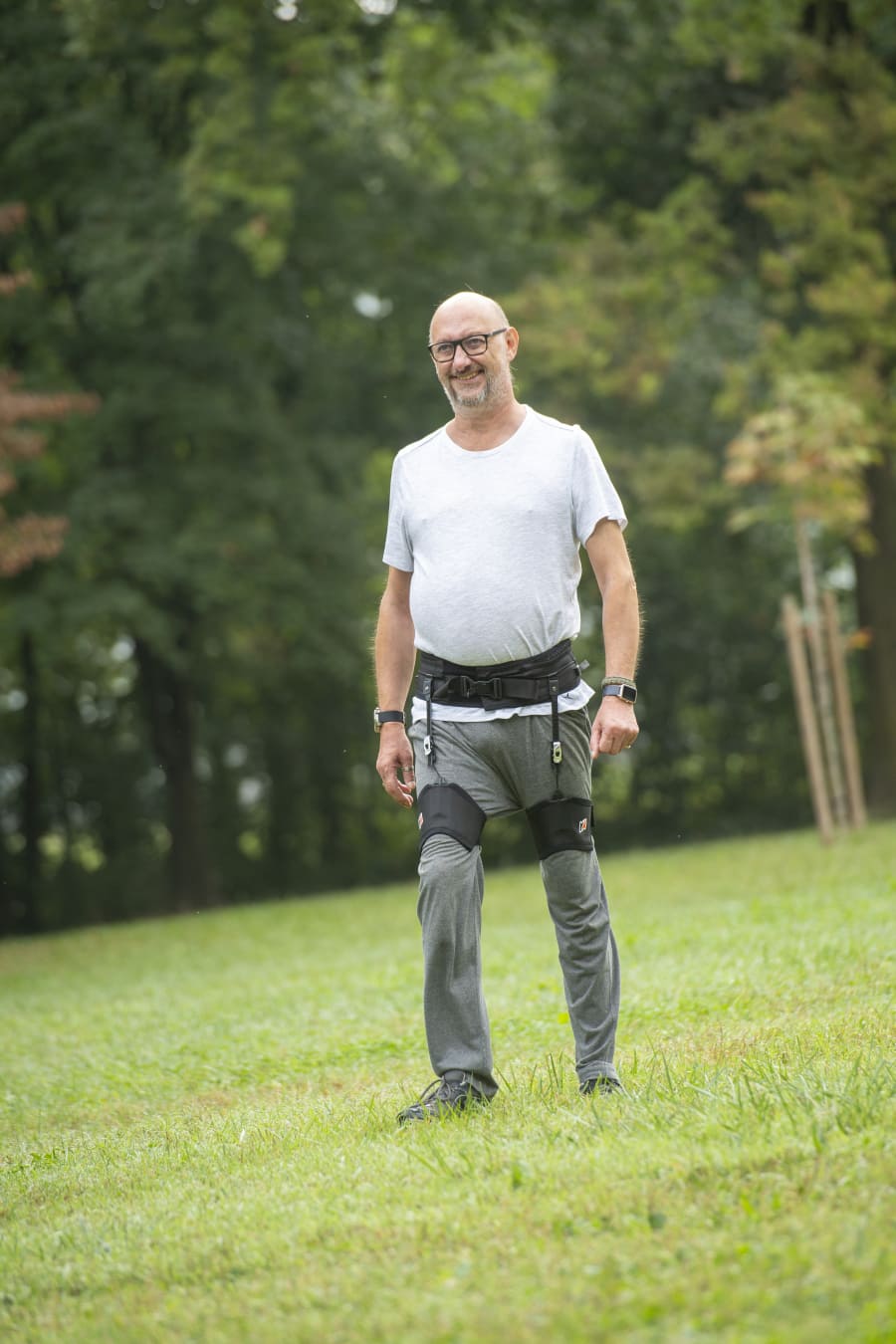 Comment ça fonctionne : composée d’une ceinture et de deux cuissards reliés par un mécanisme qui stocke l’énergie lors de la première phase du pas et la restitue lors de la deuxième phase, soutenant ainsi la propulsion des fléchisseurs de hanche.